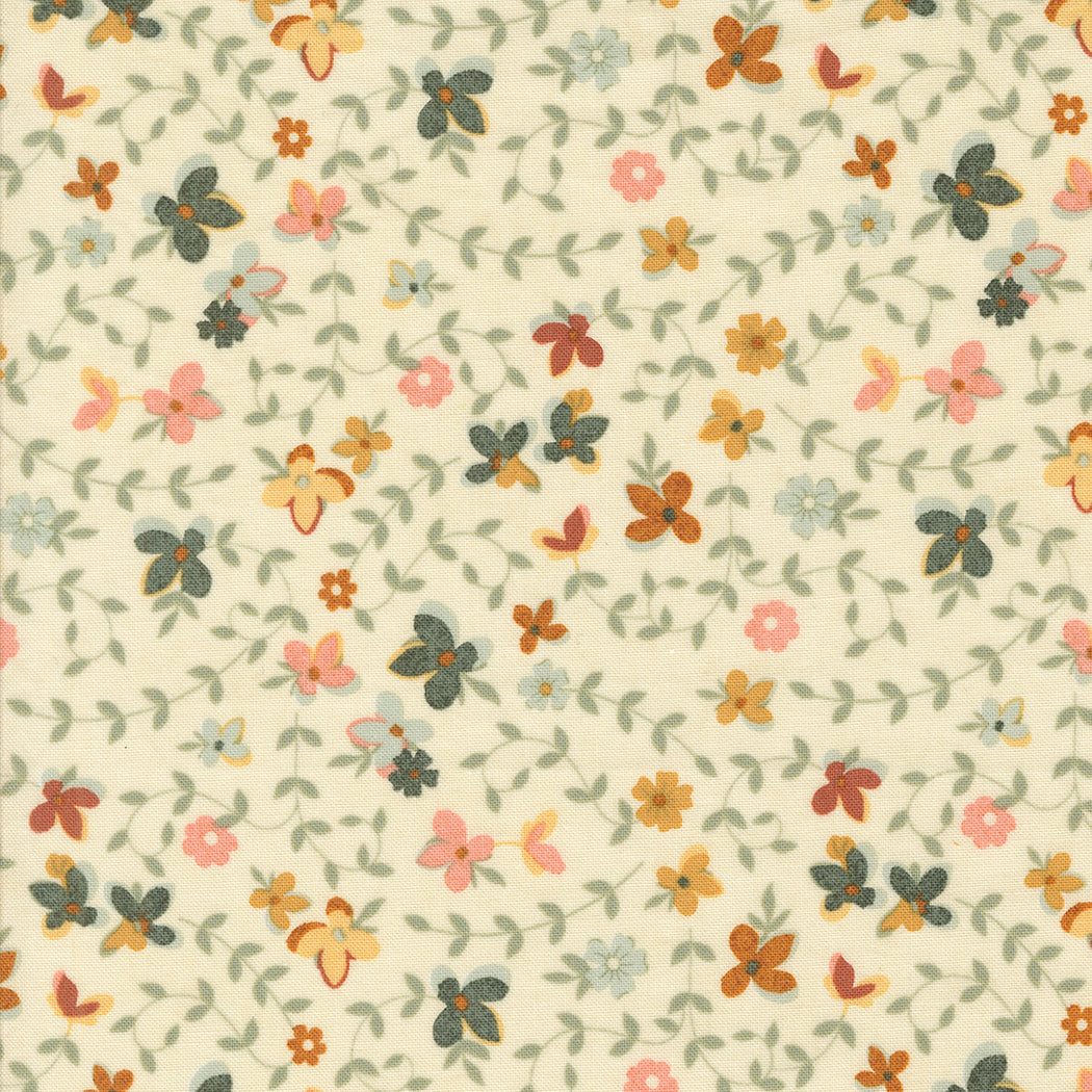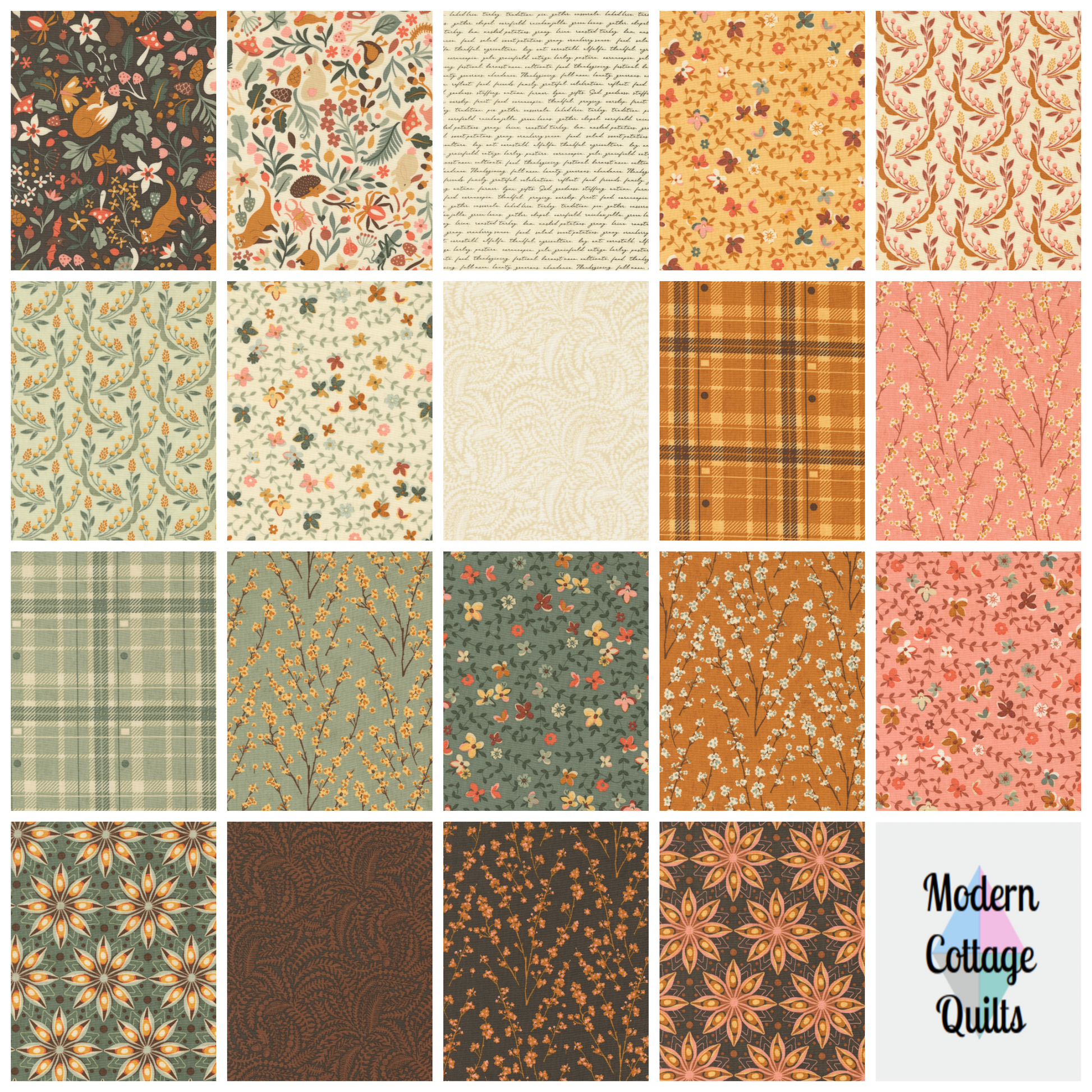 In this collection, the forest comes alive with whimsical hedgehogs, bunnies, squirrels, and foxes, all nestled among delicate mushrooms, leaves, pinecones, and acorns. Charming ladybugs, snails, and frogs add to the woodland awe, bringing a touch of nature's beauty. Intricate flora prints tell tales of twilight gatherings and the dazzling yield of the harvest season, while bold, star anise patterns celebrate nostalgic fall scents. The addition of soft, cozy, plaid prints brings depth and comfort, reminiscent of moments by the campfire." - Moda